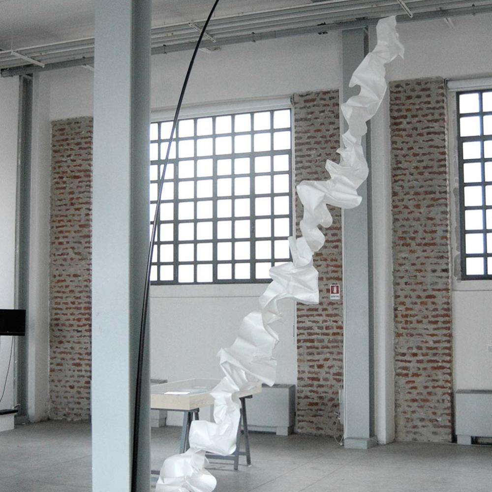 A fishing rod a nylon string and a strip of paiper inadvertently interacts in harmony through the dripping of a few drops of resin.